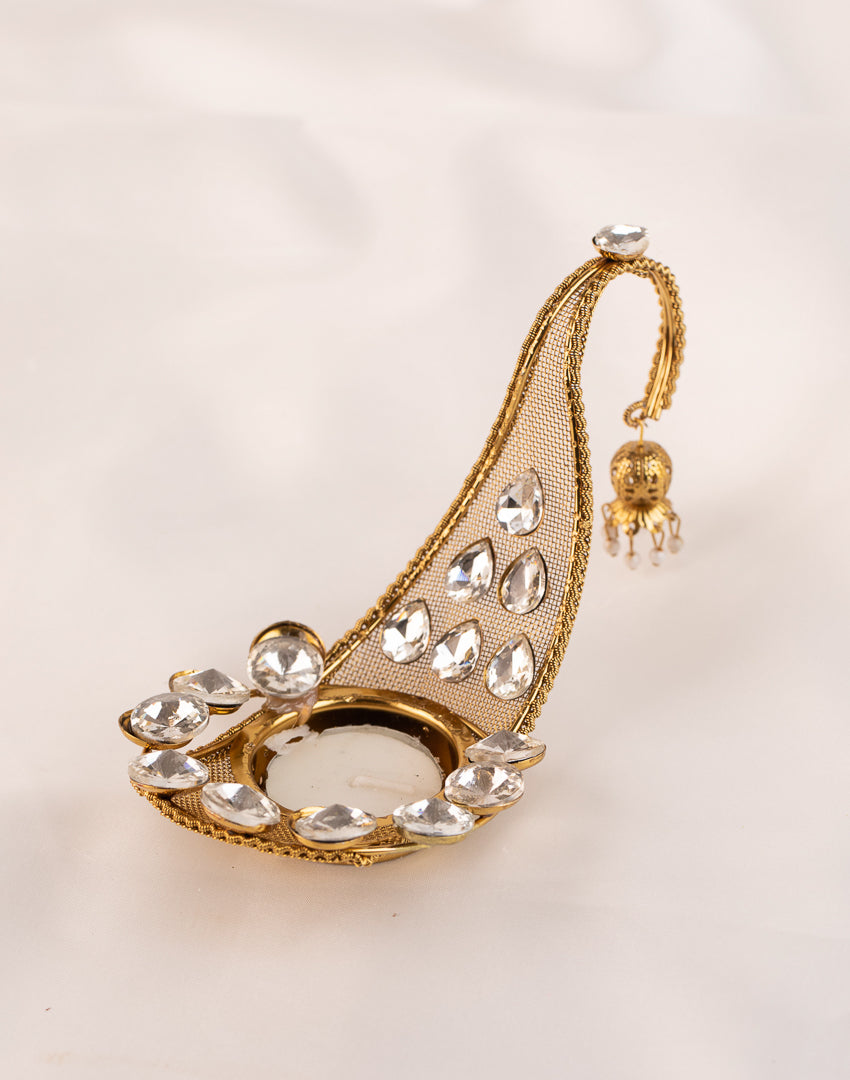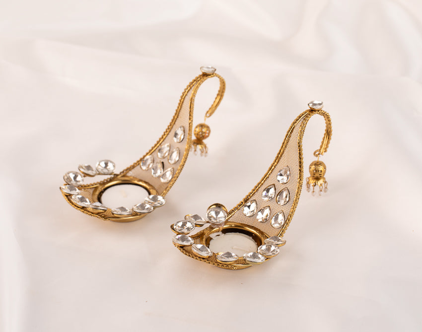 PD: This tea light candle stand features a balanced golden frame with spaciously arranged embellishments. Its refined design adds a touch of elegance, creating a sophisticated accent for any festive setting.