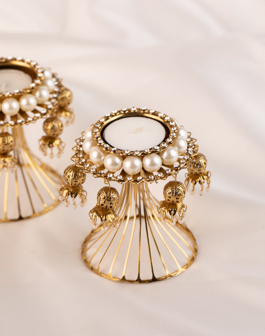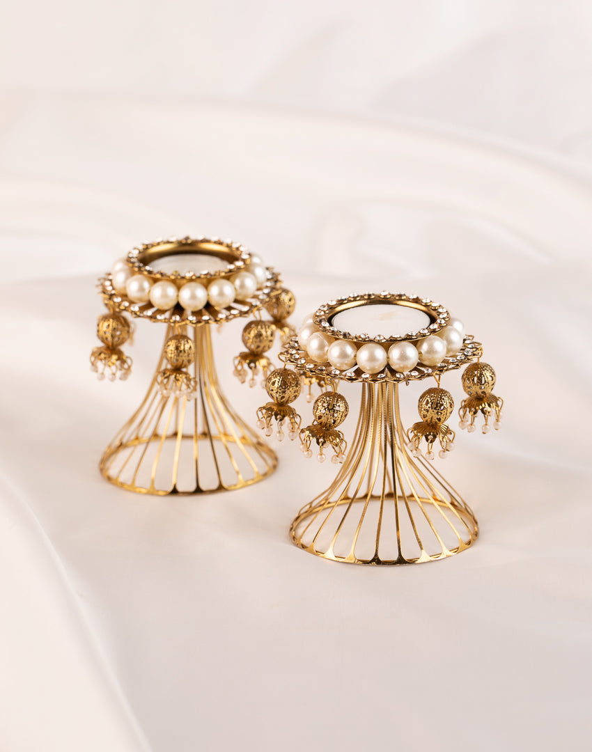 PD: Hug your décor with these elegant high-stance T-light holders, crafted from a golden frame adorned with delicate hangings and framed with lustrous pearls. Their graceful design adds a touch of opulence and sophistication to any space.
