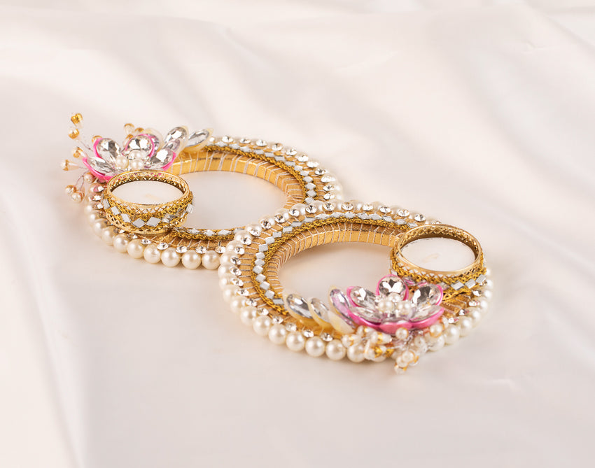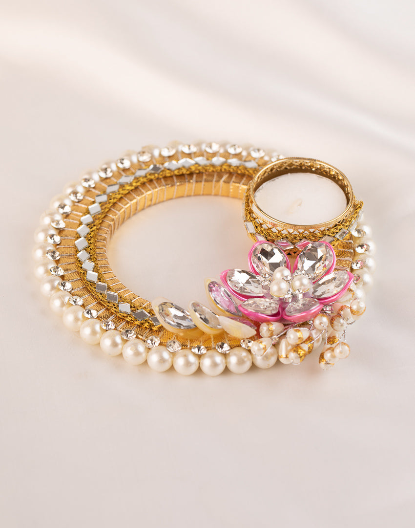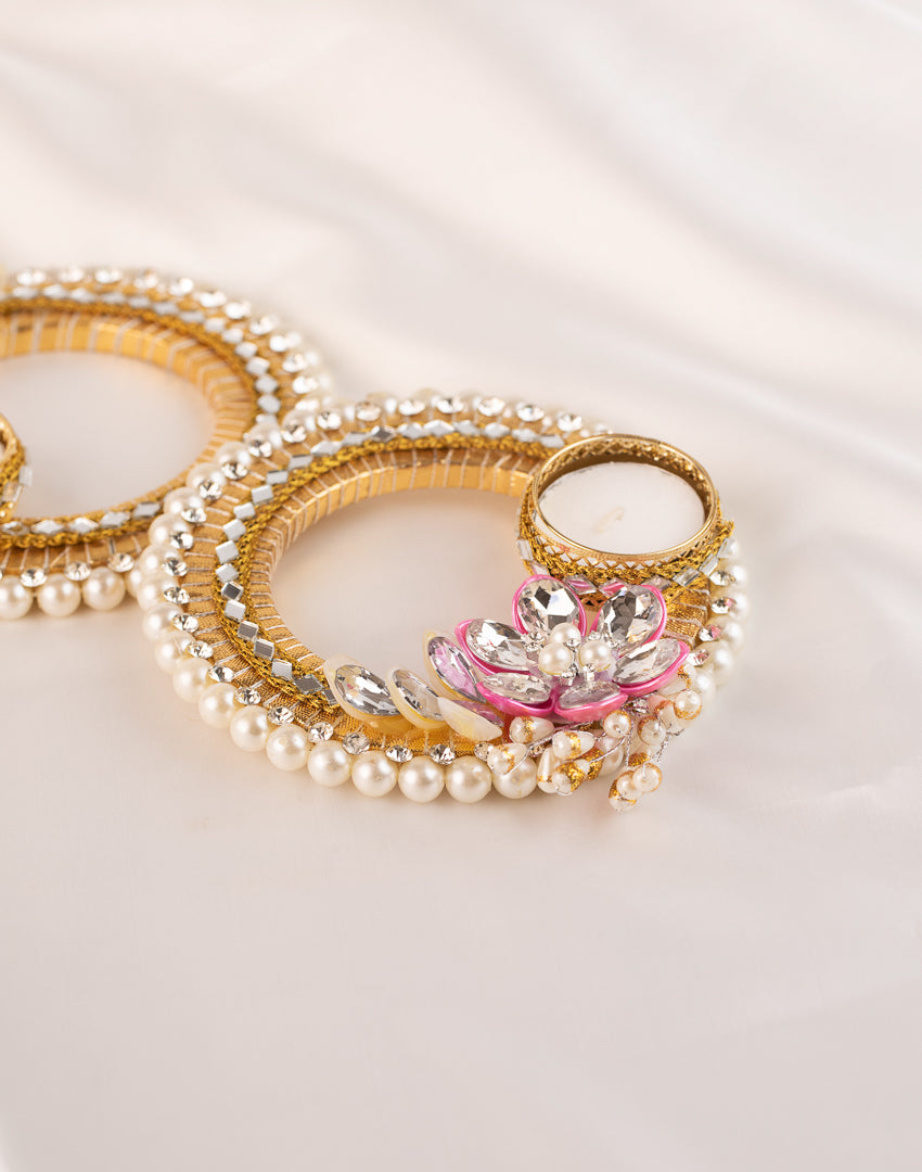Illuminate your space with this exquisite set of tea light holders, each lovingly adorned with a delicate border of lustrous pearls. A dainty flower nestled within adds a touch of nature’s grace, making these holders the perfect blend of sophistication and charm for your festivities.