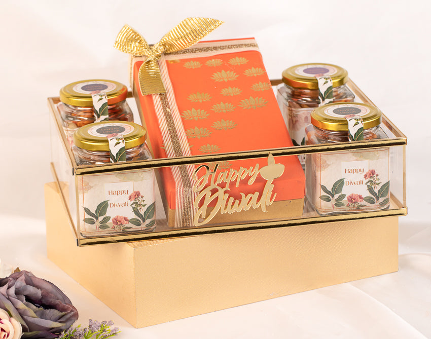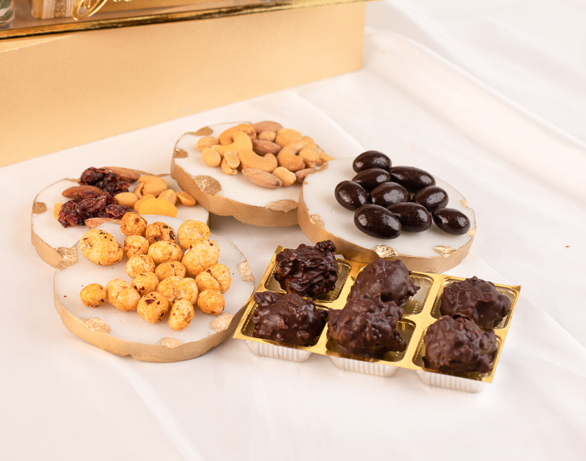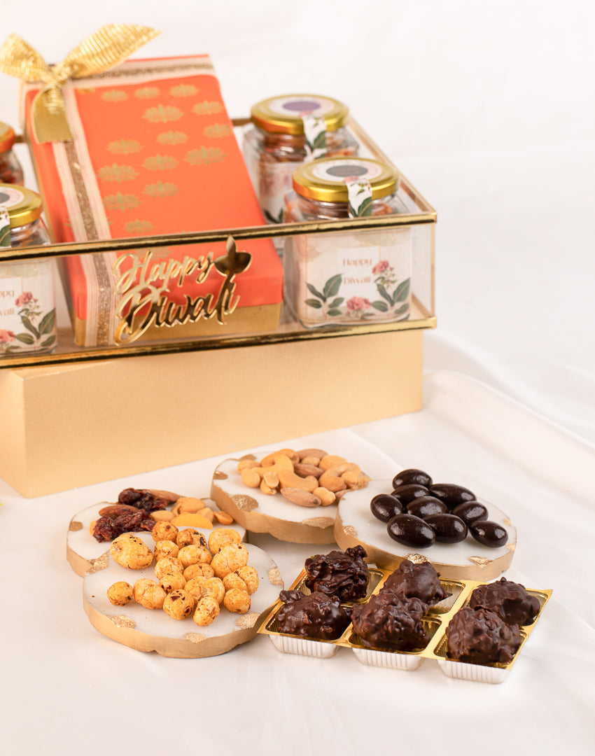 Minimalistic Gold Acrylic Tray – This sleek and modern tray features a golden acrylic design with four boxes of assorted dry fruits and a centrally placed chocolate box, combining simplicity with elegance.