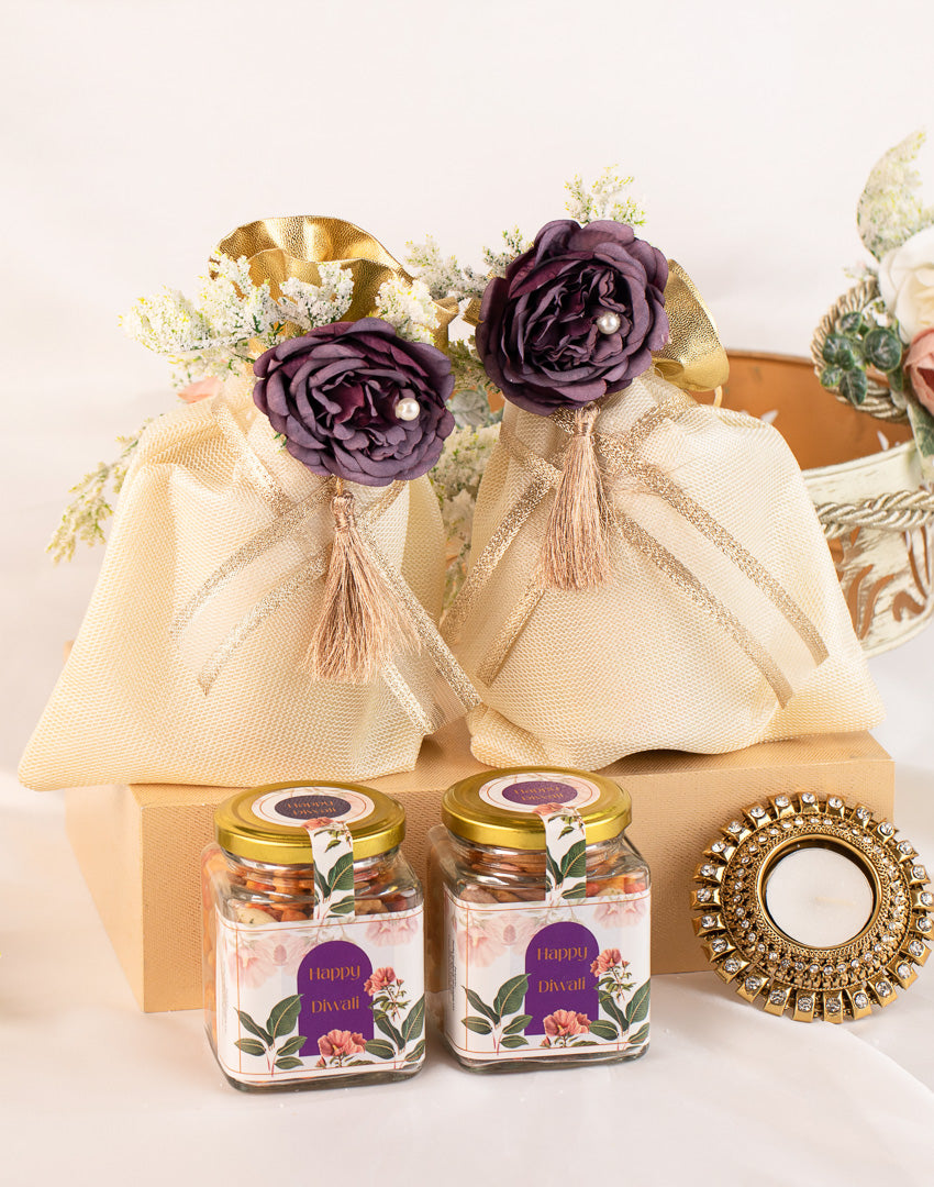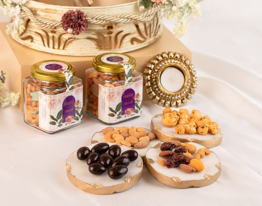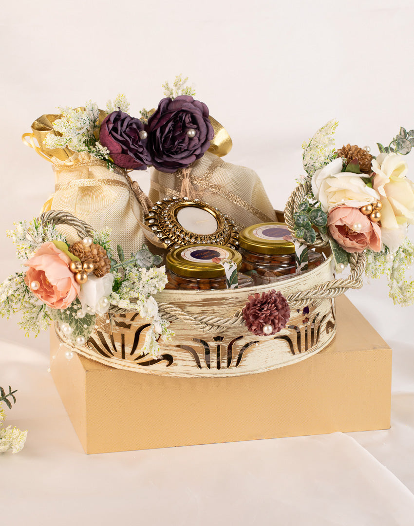 Lotus Metal Hamper – This exquisite lotus-shaped metal tray features a bunch of flowers on both ends. It includes four boxes of assorted dry fruits and one elegant tea light candle holder, making it a perfect blend of sophistication and charm.