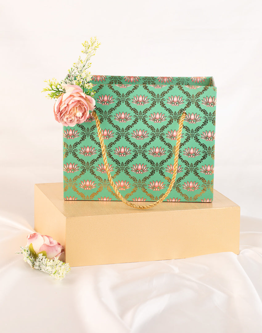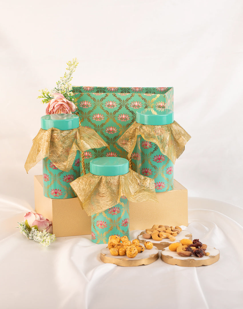 Lotus Print Gift Hamper – This charming hamper comes in a lotus print carry bag and includes three boxes of dry fruits, each adorned with mint green and raisin lotus prints. Ideal for festive gifting, it combines elegance with practicality.