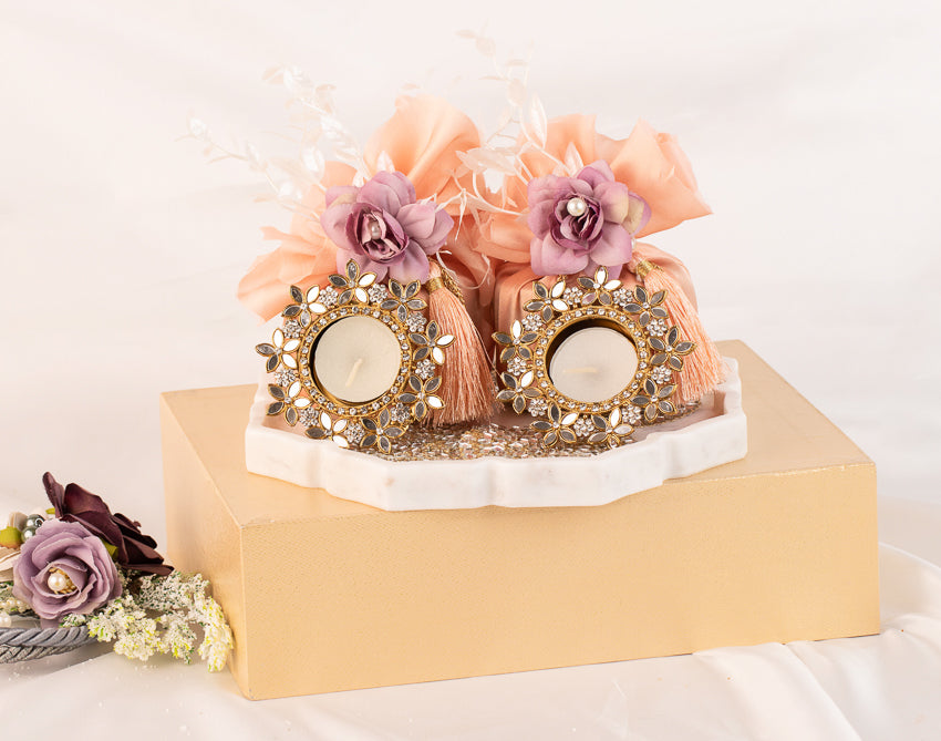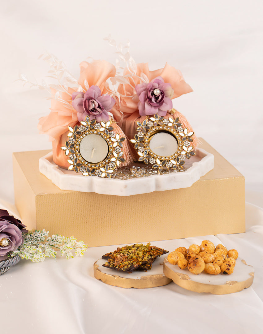 Lotus-Shaped Marble Hamper: This exquisite hamper features a beautifully crafted lotus-shaped marble tray. Inside, you'll find two boxes of assorted dry fruits and two elegant tea light candle holders. The hamper is thoughtfully packed with fabric wrapping, adorned with flowers at the top, and finished with tassel work, making it a stunning and refined gift choice for any special occasion.