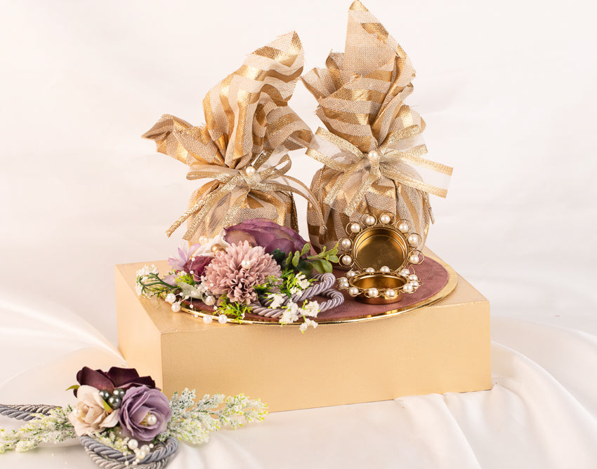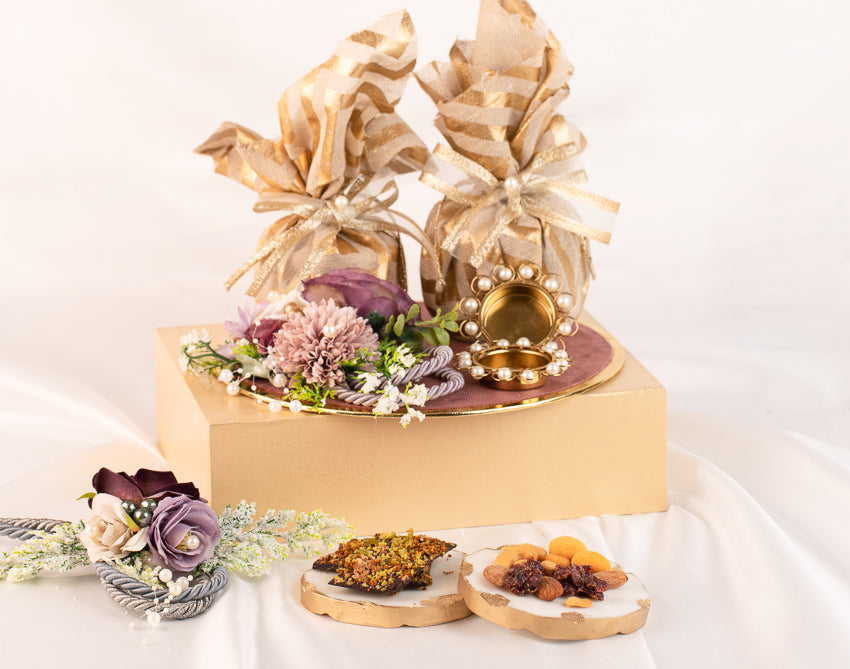 The Mauve Jute Hamper is a charming blend of simplicity and elegance. Featuring a rustic jute box in a soft mauve hue, it comes filled with handpicked dry fruits and includes two delicate tea light candle holders. Perfect for gifting, it brings a natural, earthy touch to any festive celebration.