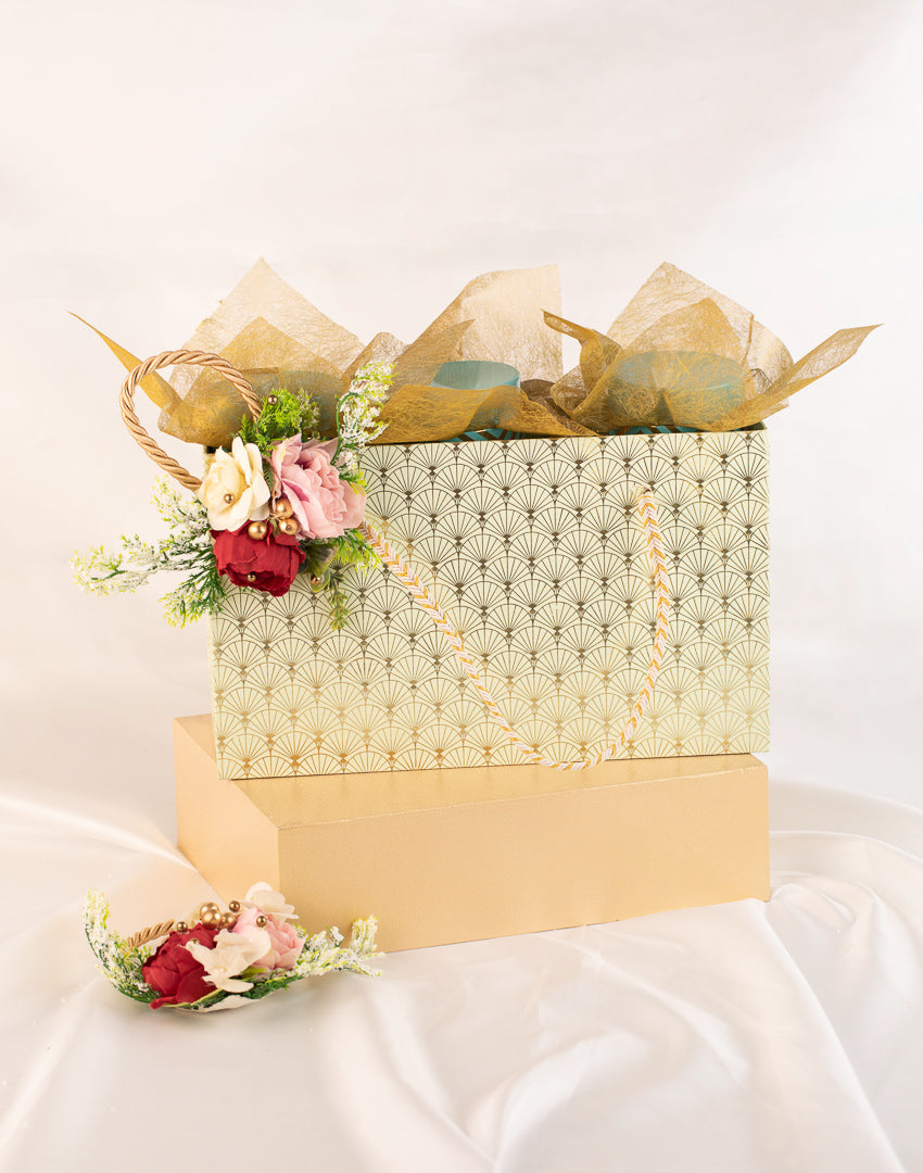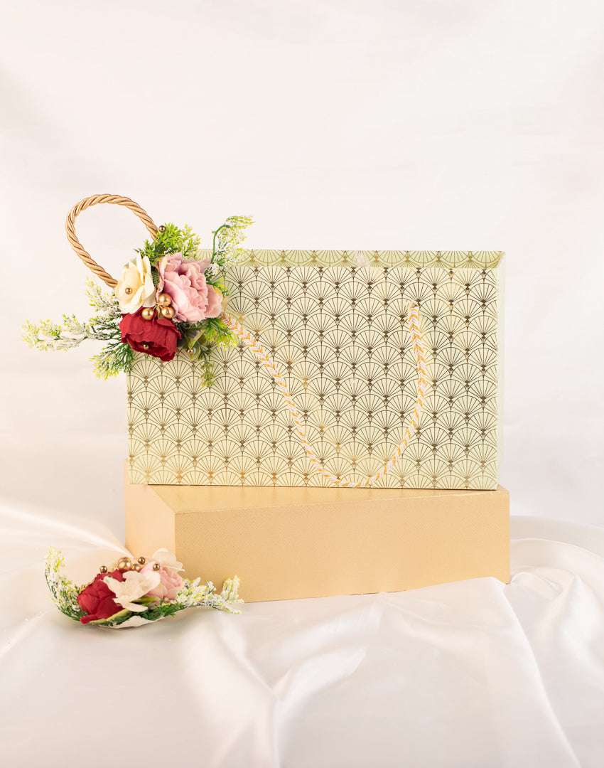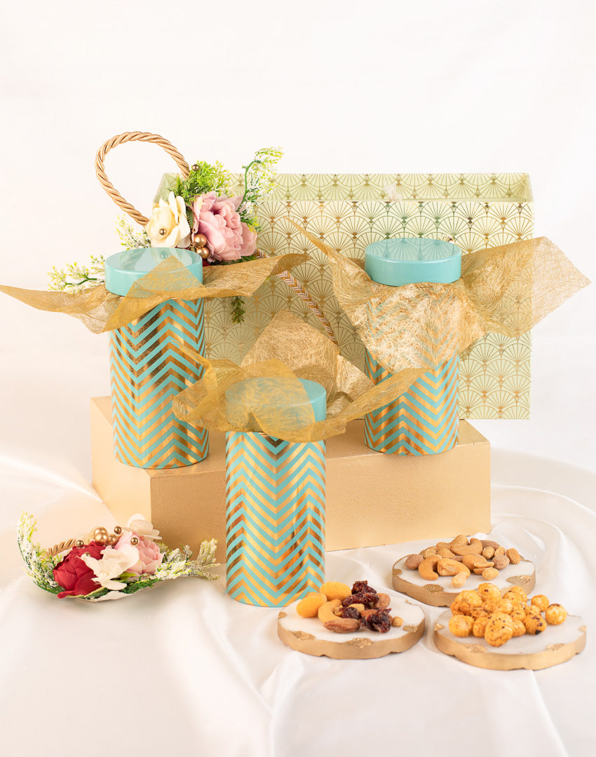 The Mint Green 3-Jar Box is beautifully adorned with floral decorations, adding a touch of elegance. Each jar is filled with premium dry fruits, making it a perfect blend of luxury and taste. Ideal for festive gifting or special occasions.