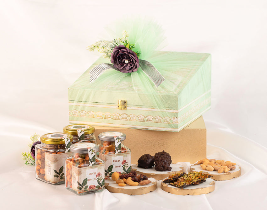 This elegant jewelry box has been transformed into a luxurious gift box, adorned with a delicate ribbon and a flower on top. Inside, you'll find four beautifully arranged compartments filled with dry fruits, chocolates, and more. Perfect for festive gifting or any special occasion, it offers a touch of sophistication and charm.