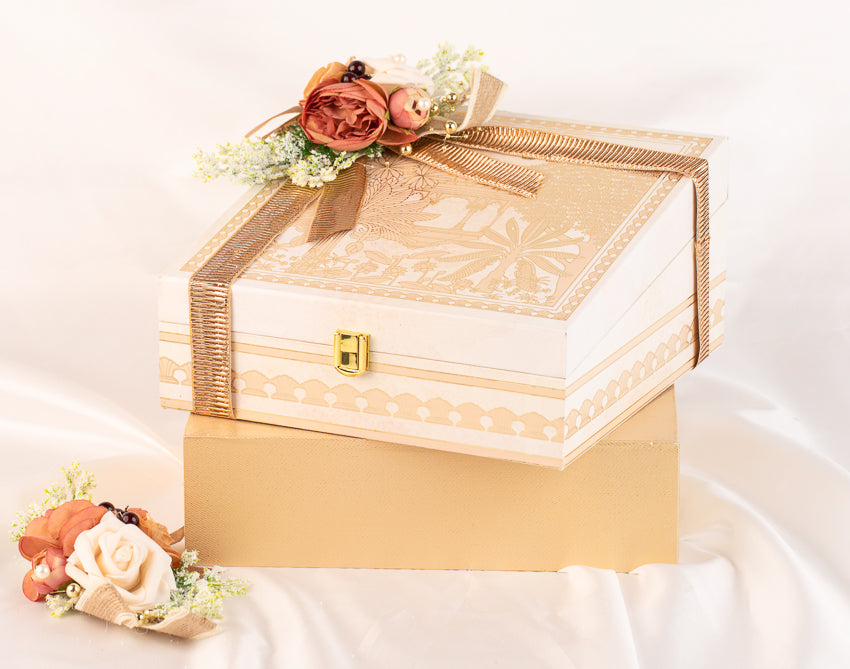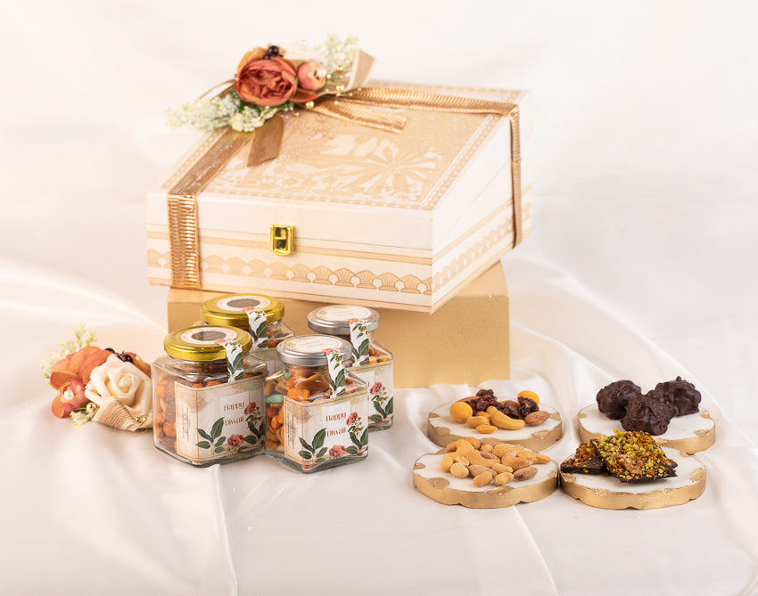 This elegant jewelry box has been transformed into a luxurious gift box, adorned with a delicate ribbon and a flower on top. Inside, you'll find four beautifully arranged compartments filled with dry fruits, chocolates, and more. Perfect for festive gifting or any special occasion, it offers a touch of sophistication and charm.