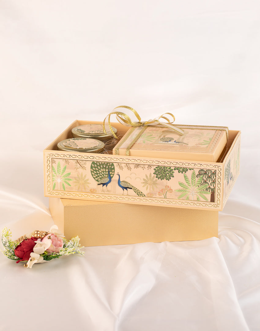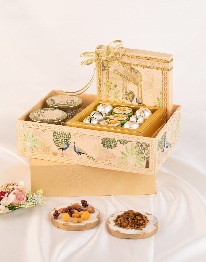 Morbag Artwork Open Box – This exquisite hamper features a Morbag tray adorned with intricate artwork of trees and peacocks. Inside, you'll find a box of sweets and two containers filled with a variety of assorted dry fruits.