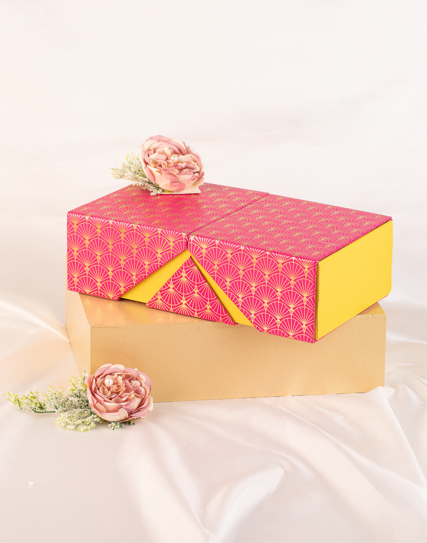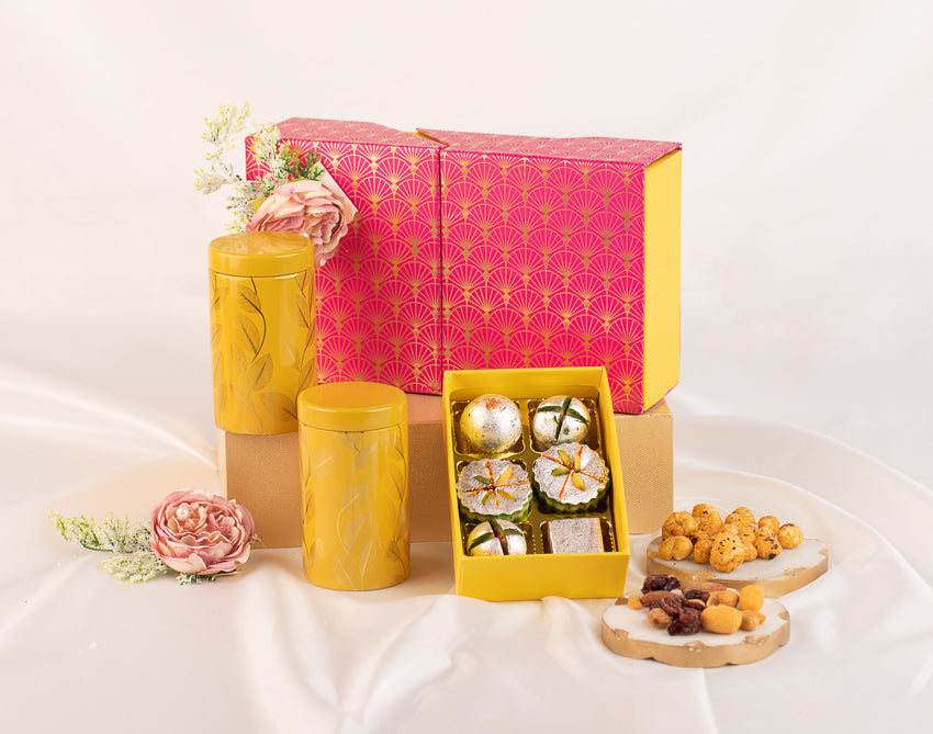 Rani Pink Open Jar Box – This vibrant hamper features a box of sweets and two distinct boxes filled with dry fruits. Its striking blend of yellow and pink, adorned with golden work, adds a touch of elegance and festivity.