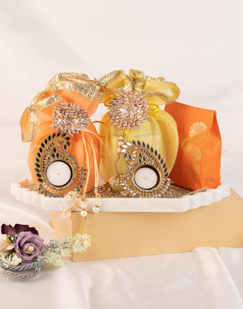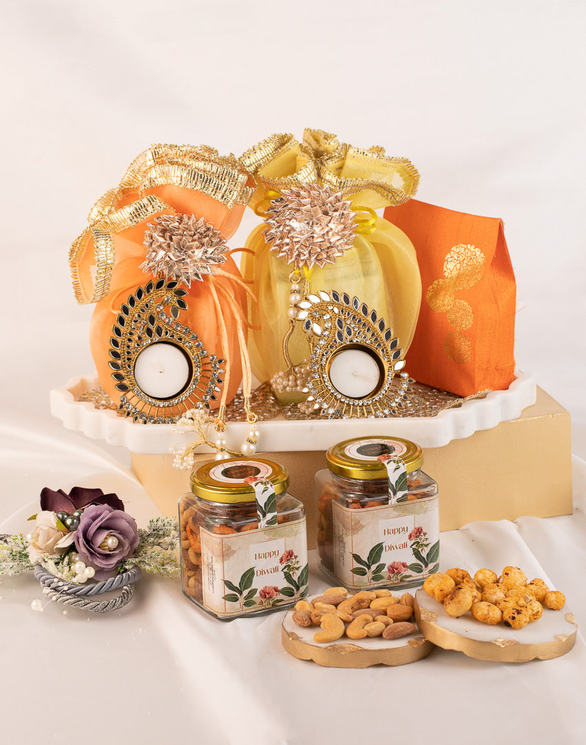 Rectangle Marble Hamper: This sophisticated hamper features a sleek marble tray with an assortment of dry fruits neatly arranged in various containers. It also includes two elegant tea light holders, making it a perfect choice for a refined and tasteful gift. Ideal for any special occasion, this hamper combines luxury and practicality with its marble elegance and diverse selection of treats.