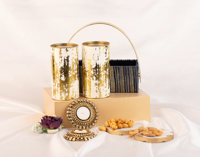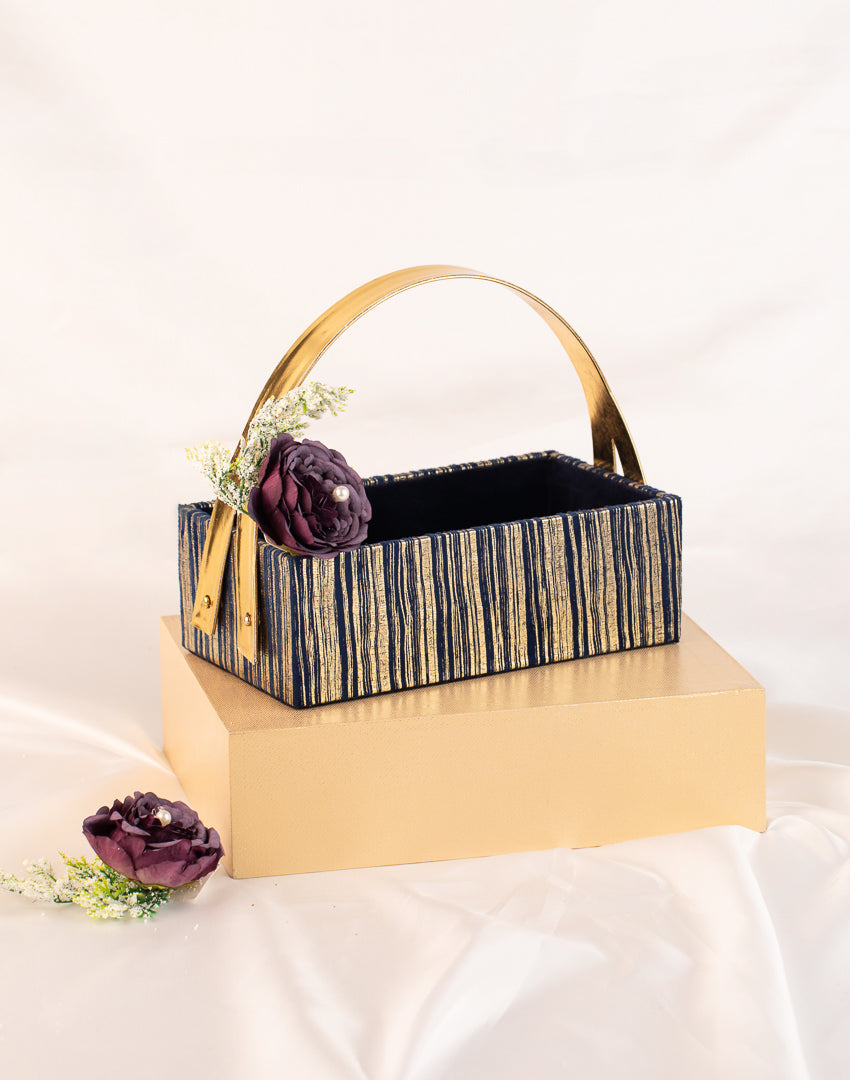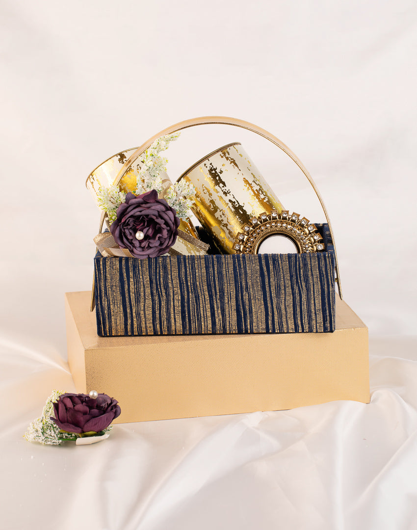 The Royal Blue Basket exudes luxury with its deep blue tones, adorned with elegant flowers. Inside, you’ll find two beautifully crafted boxes filled with premium dry fruits, accompanied by two stunning tea light candle holders. This basket is the perfect choice for adding a touch of opulence to any celebration.