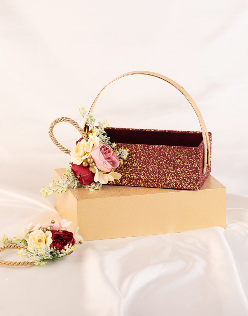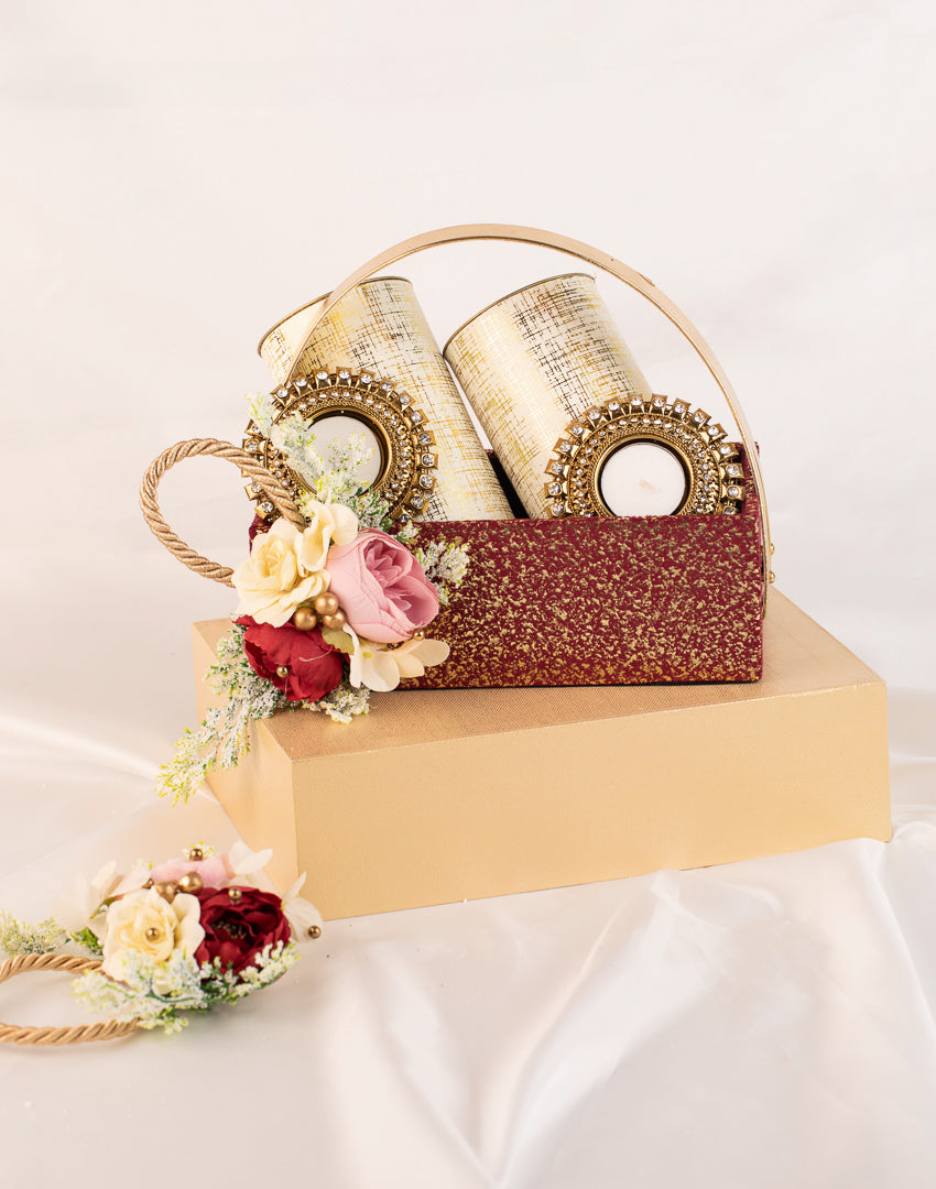 The Royal Burgundy Basket exudes luxury with its deep burgundy tones, adorned with elegant flowers. Inside, you’ll find two beautifully crafted boxes filled with premium dry fruits, accompanied by two stunning tea light candle holders. This basket is the perfect choice for adding a touch of opulence to any celebration.