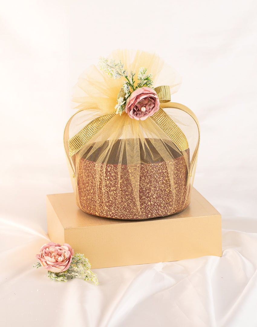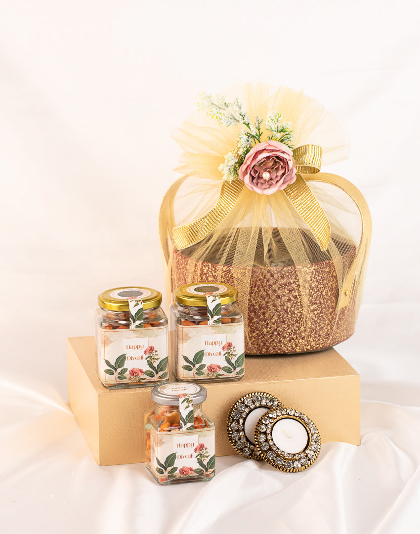 This Circular Hamper is wrapped in luxurious fabric and adorned with a flower bow, offering a touch of elegance. It includes three boxes of premium dry fruits and two exquisite tea light candle holders, making it a beautifully presented and thoughtful gift for any special occasion.