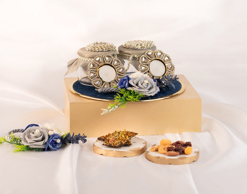The Suede Platter Hamper features two luxurious boxes filled with premium dry fruits, elegantly packed for a touch of indulgence. Paired with two beautifully crafted tea light candle holders, this hamper offers a perfect blend of festivity and elegance, making it an ideal gift for special occasions.