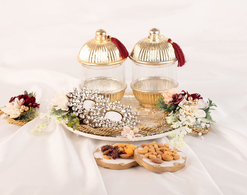 Opulent Mirrored Platter Hamper – This exquisite hamper features a mirror-like platter encircled with a beautiful arrangement of flowers. It includes two crystal-embellished tea light candle holders and two elegant containers with golden tops and bottoms, transparent centers, and tassels. The containers are filled with premium dry fruits, offering both visual and culinary delight.