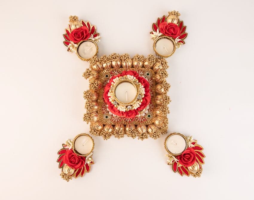 This small Rangoli features a central square crafted entirely from golden buds, each adorned with tiny golden balls at the ends. Surrounding it, four corners hold lotus frames with delicate rose accents, encompassing five tea light holders in a design that combines intricate detailing with elegant charm.