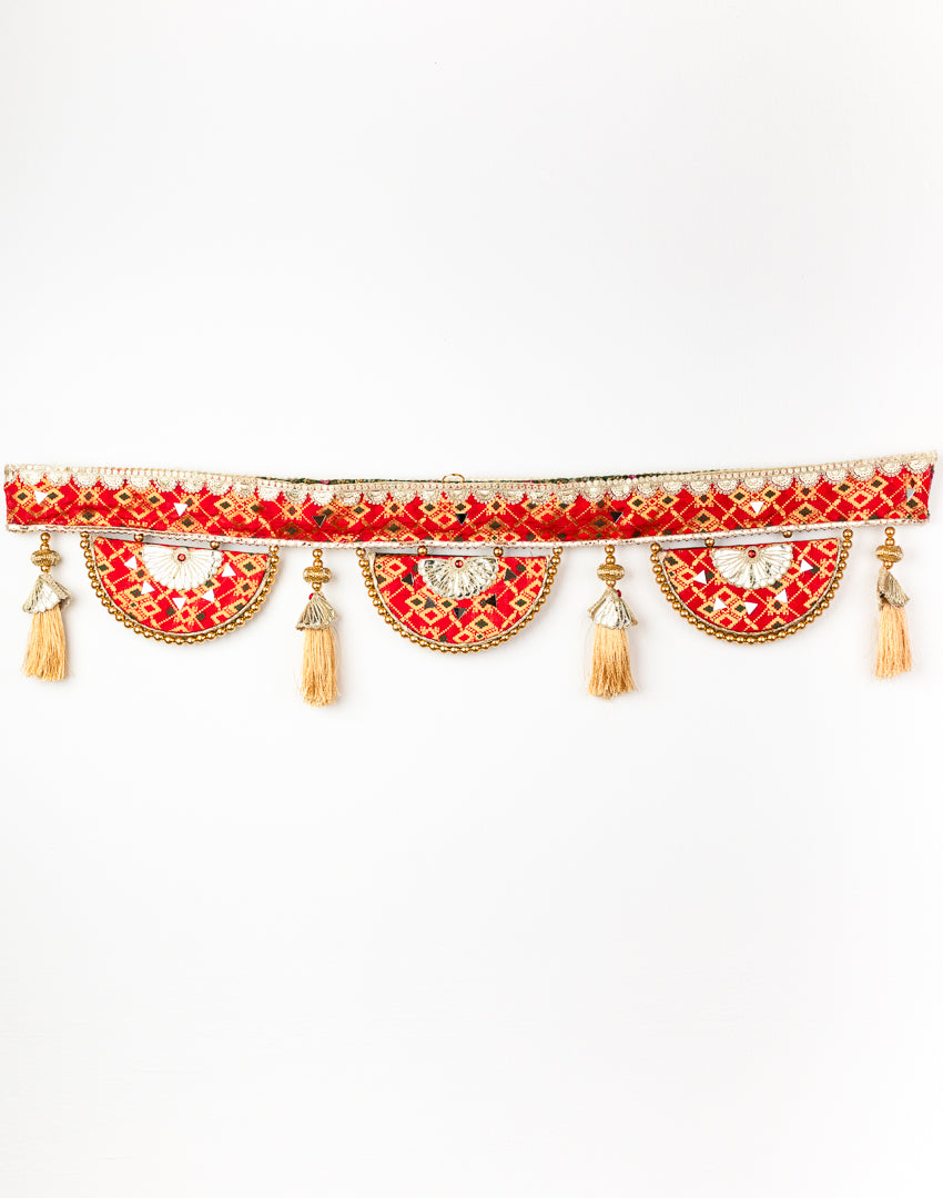 The Bandhani Tassel Thoran showcases intricate Bandhani design in a vibrant red, enhanced with elegant tassel hangings. This horizontal Thoran brings a rich, traditional touch to your décor, combining classic patterns with a festive flair.