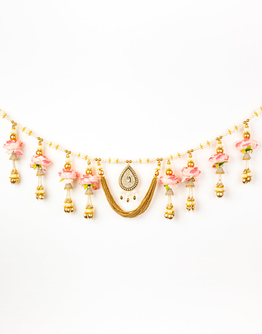 The Festive Pearl Thoran blends elegant floral motifs with shimmering pearls and golden beads. This exquisite horizontal hanging adds a touch of sophistication and charm, creating a beautifully festive ambiance for any occasion.