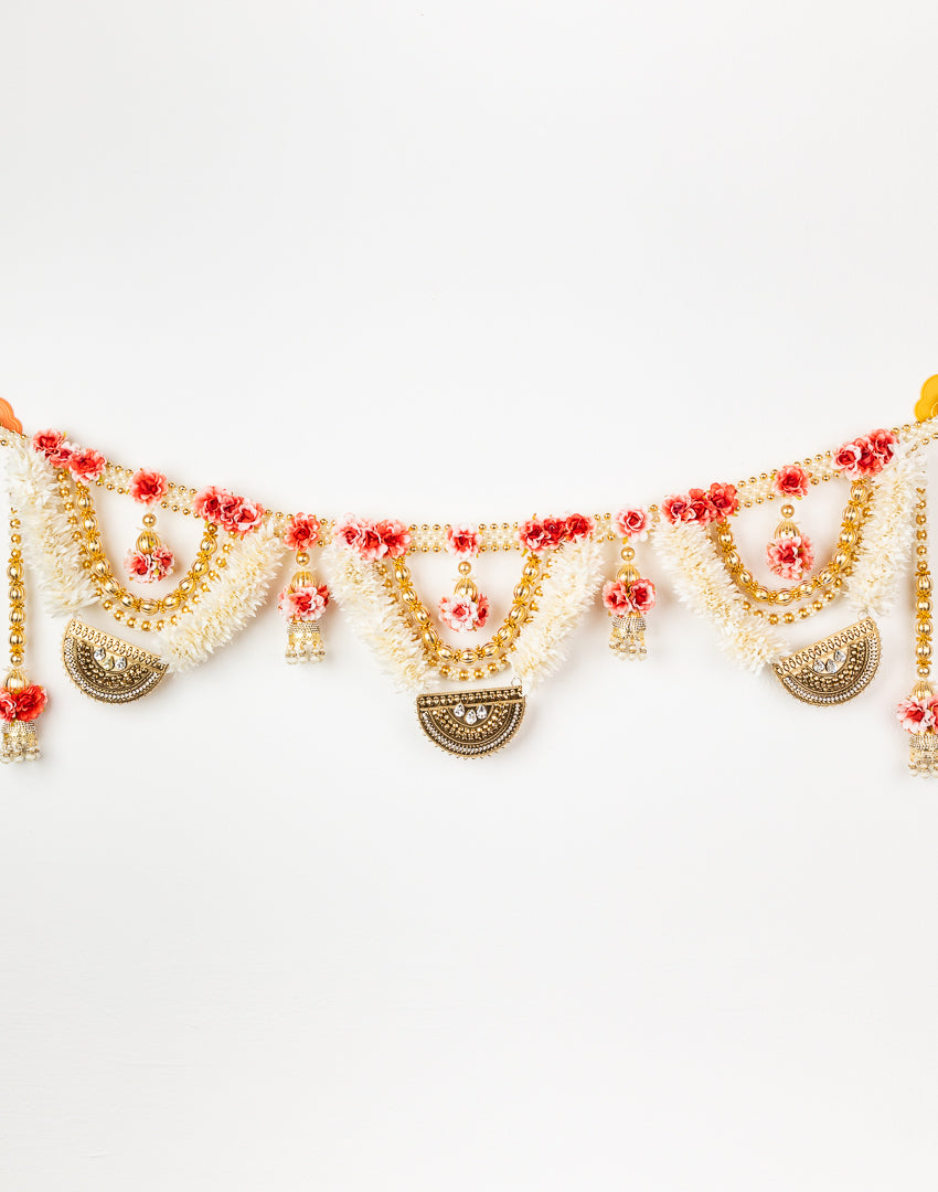 The Ivory Blossom Thoran combines vibrant red and elegant white flowers, adorned with embellished hangings at the end. This striking horizontal Thoran adds a bold yet refined touch to your décor, perfect for celebrating special occasions with style.