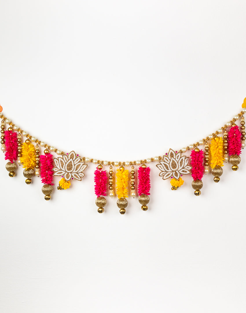 The Lotus Harmony Thoran features vertical hangings of distinct-coloured flowers, complemented by a grand lotus embellished with golden and pearl work. This exquisite Thoran blends vibrant floral elements with luxurious detailing, creating a stunning and festive centrepiece for your décor.