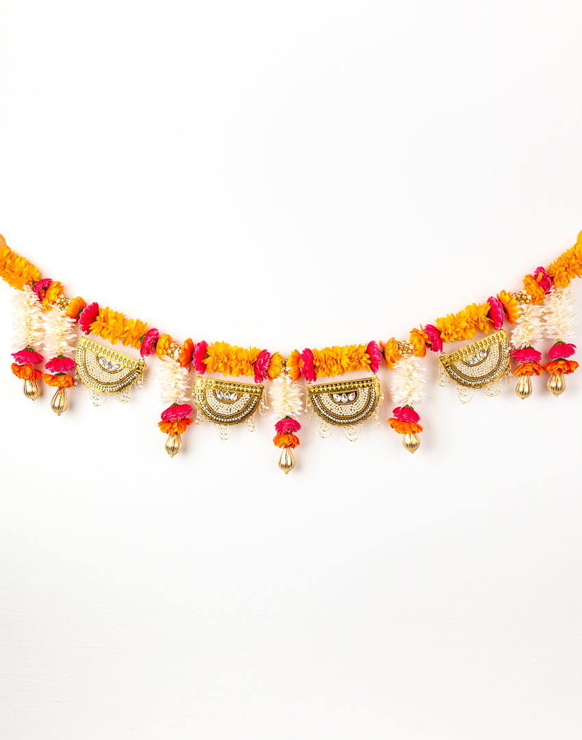 The Saffron & Pearl Thoran showcases a lively mix of yellow, red, and white flowers, elegantly combined in one beautiful hanging. Enhanced with metallic beads at the end, this decorative piece brings a cheerful and festive touch to any setting.